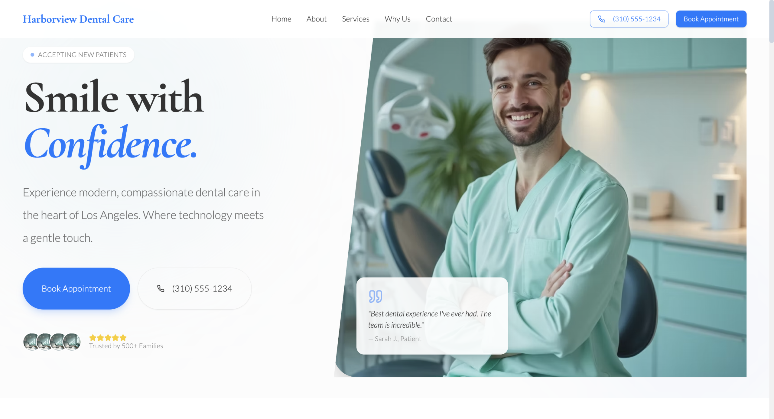 Concept website for a Los Angeles dental practice, designed to build trust and convert visitors into booked appointments through clear messaging, clean layout, and strong calls to action.